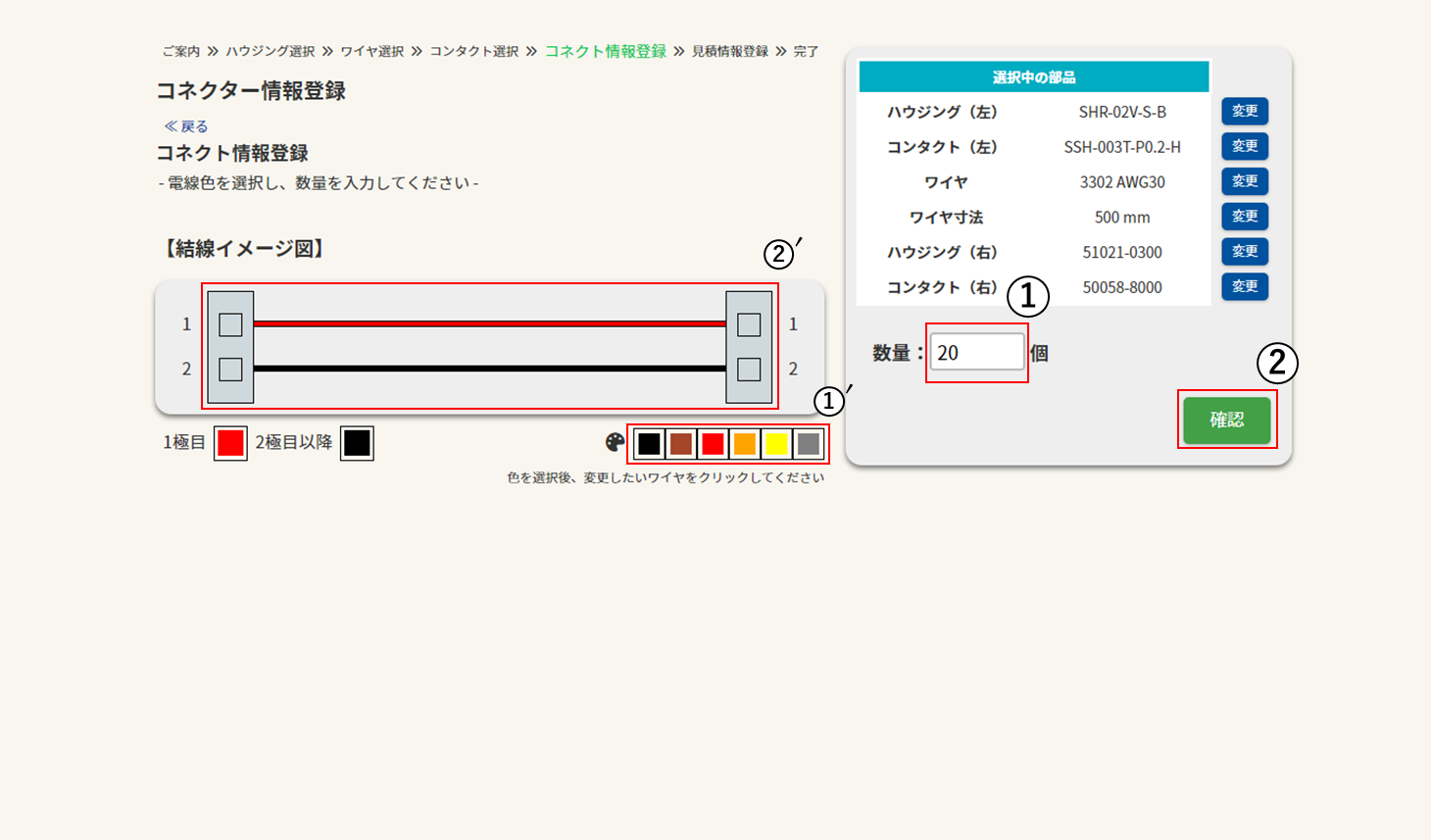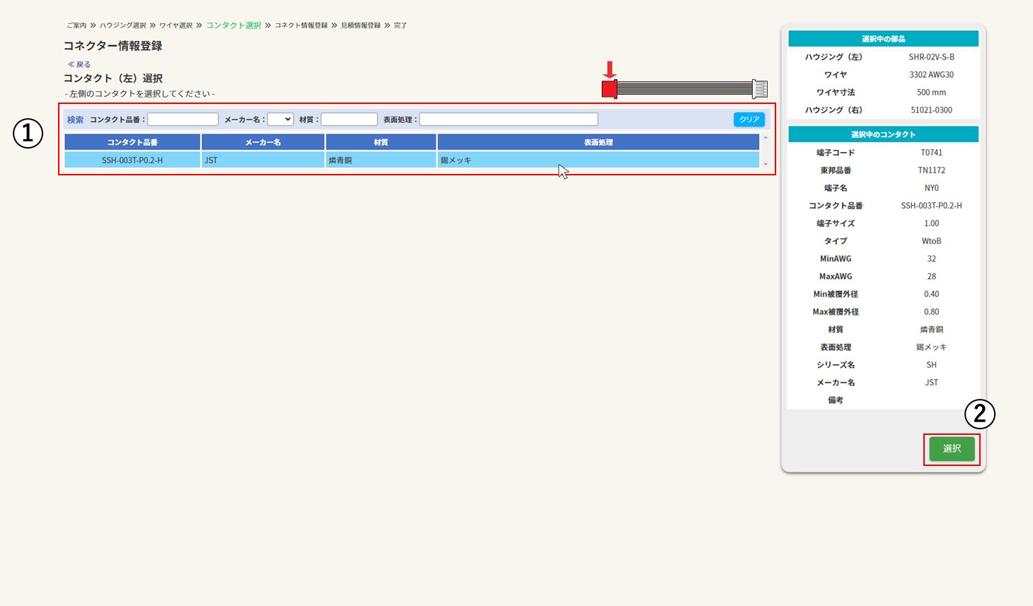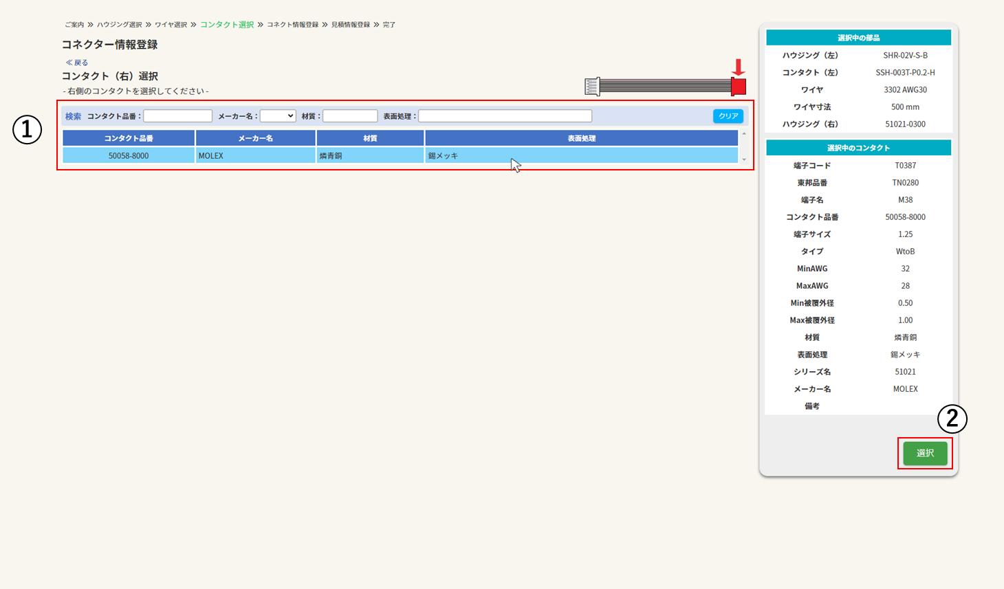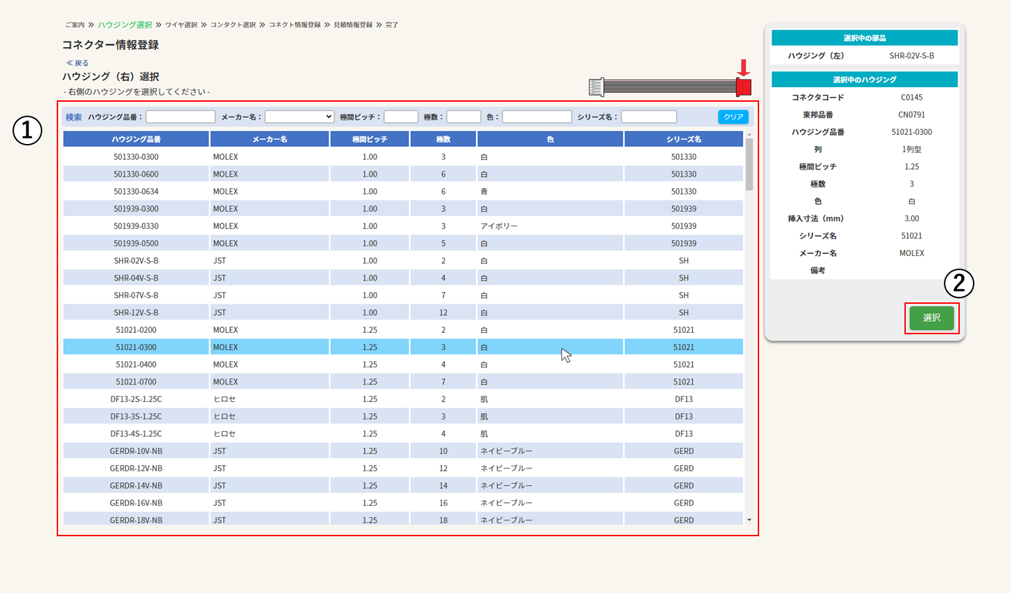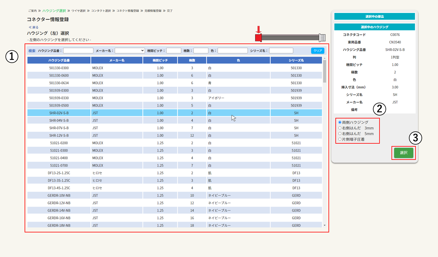 ※「両側ハウジング」で左右のハウジングが異なる場合か、「片側端子圧着」の場合のみ選択できます