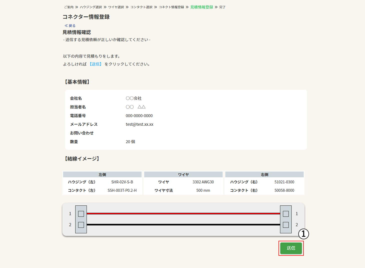 - ① 表示されている内容を確認後、送信ボタンをクリック(メールが送信されます)
